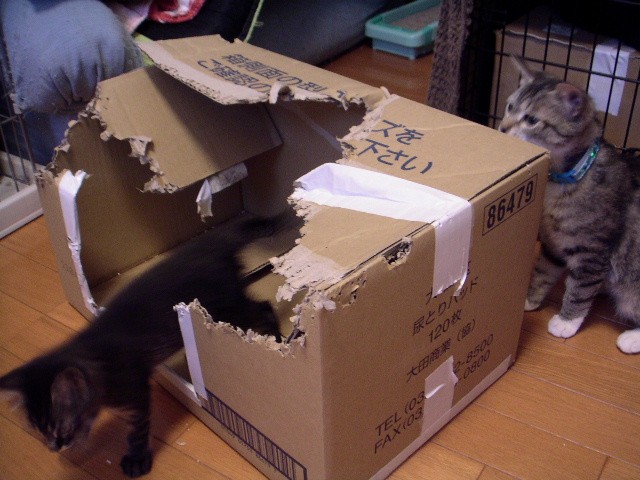 そこへもってきて遊び盛りのがっちゃんと、これまた「遊んでないと死んじゃう病」の小雪乳母が日に何度か乱入し、わずか5畳程の保護部屋は猫率がめっちゃ高くなっております。