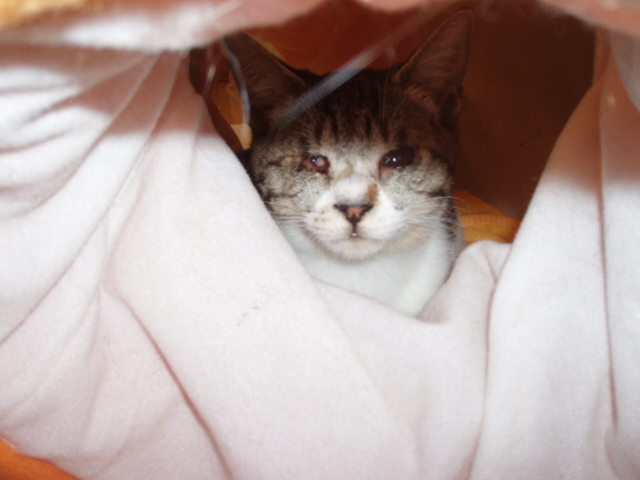 我が家にはすでに重症の病気の子数匹を含め15匹の猫がおり、目の見えないこの子猫をいろいろな意味で守る為もあり、一生ケージ中心の生活になってしまいます。