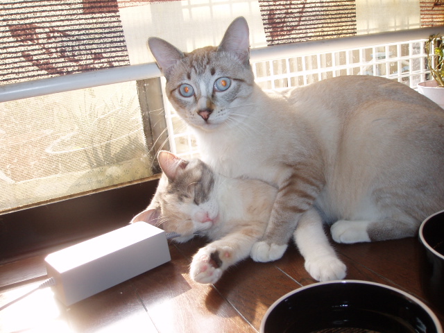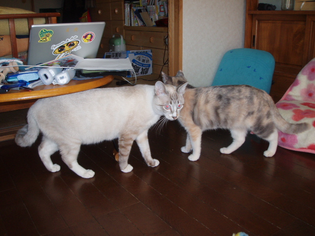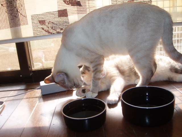 シュシュは「なによ、このださい男」とばかりに初めは「ふぁー!」と怒っていましたが 最近はポーがいないとみゃーみゃーと寂しがります。