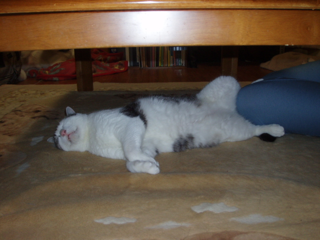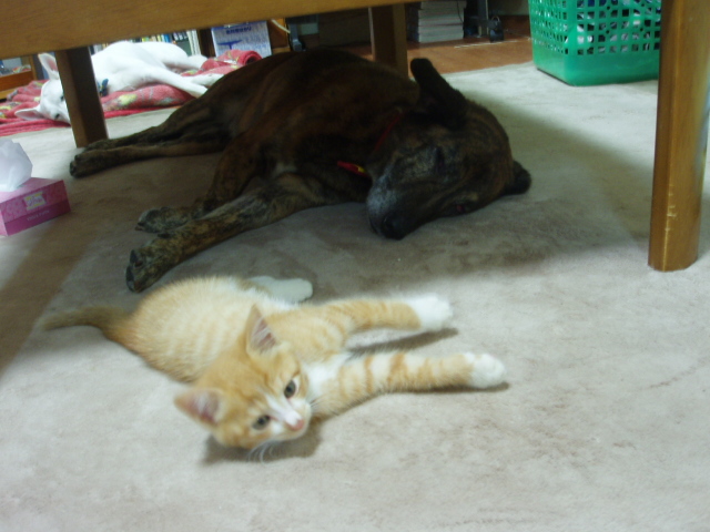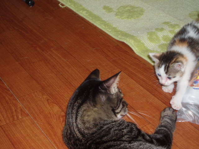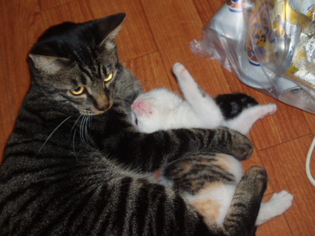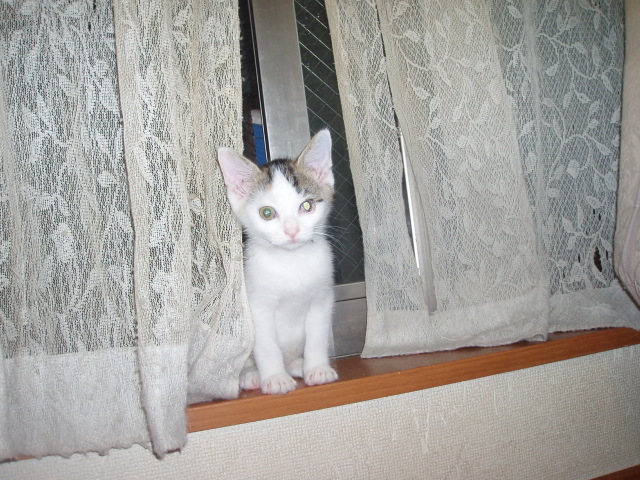保護宅一番のビビリ猫。別名=家庭内野良猫。保護前の恐怖がトラウマになっていて人間にはあまり近寄らない。が、猫には常に友好的。あまりにスキすぎてしつこくつきまとい嫌われる。仔猫のお世話したくても仔猫にウザがられる。
