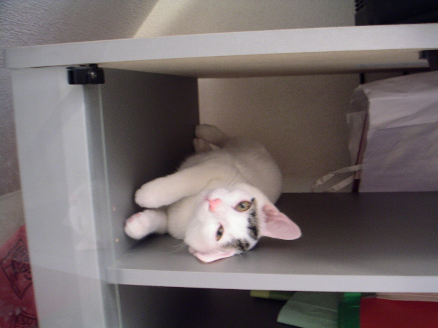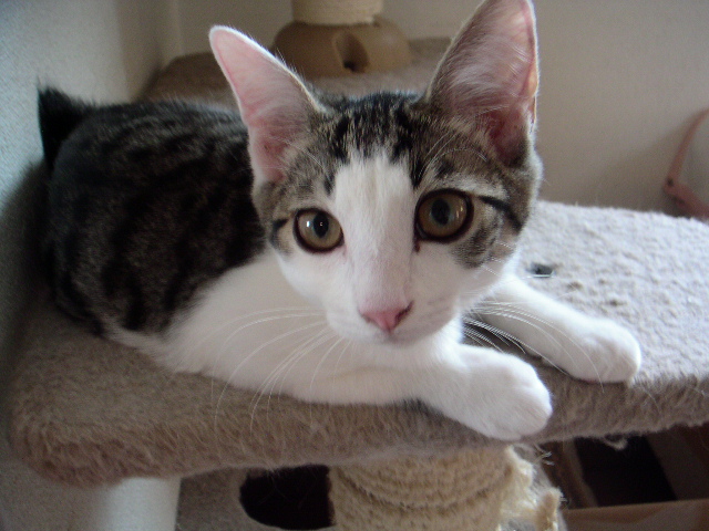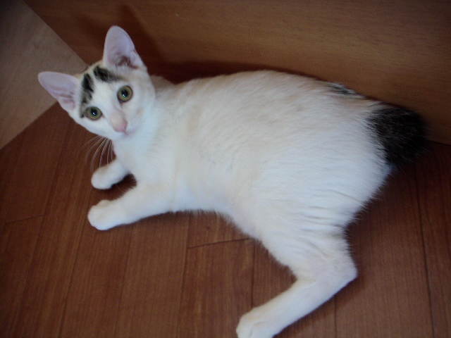 保護宅一番のビビリ猫。別名=家庭内野良猫。保護前の恐怖がトラウマになっていて人間にはあまり近寄らない。が、猫には常に友好的。あまりにスキすぎてしつこくつきまとい嫌われる。仔猫のお世話したくても仔猫にウザがられる。